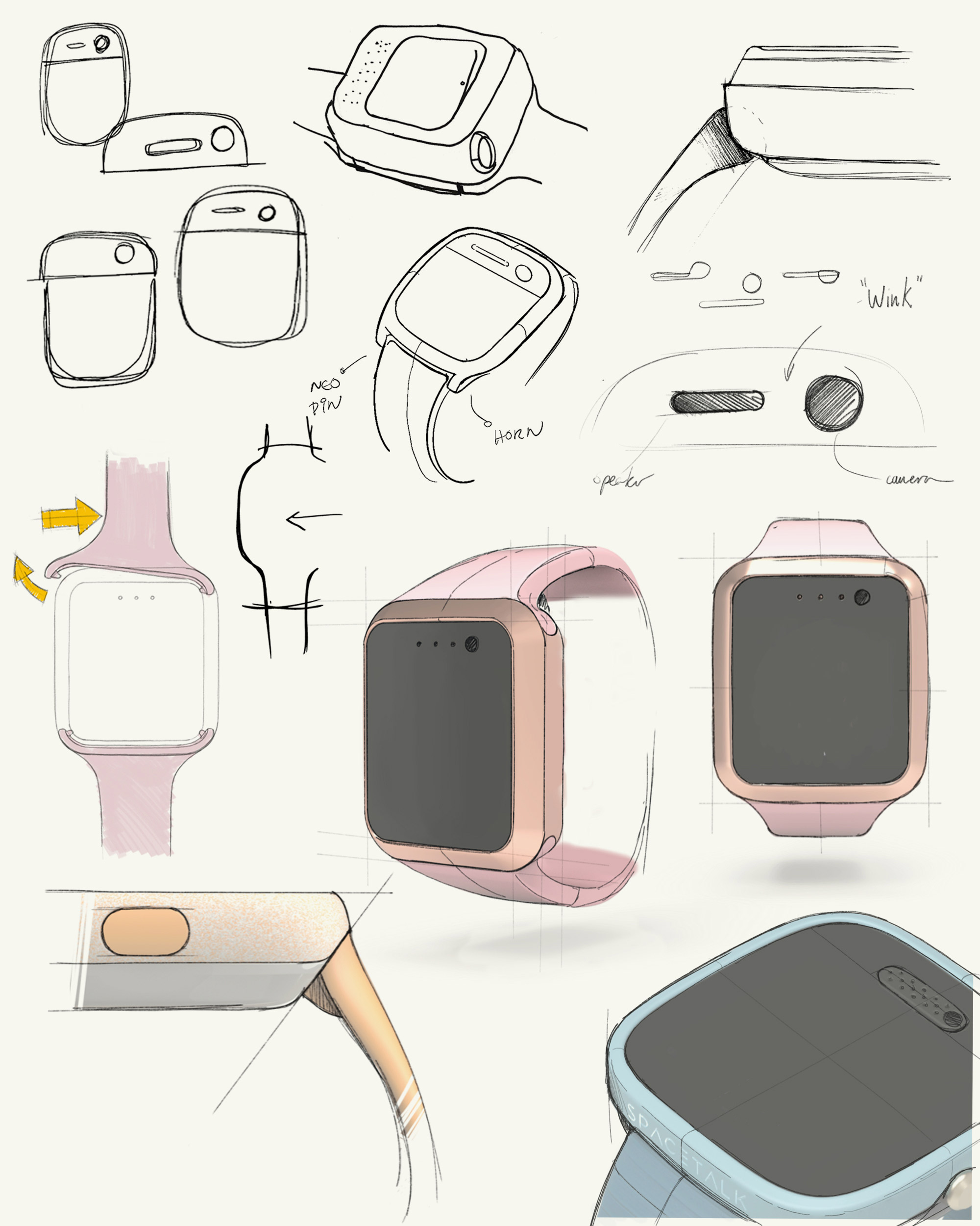 Multiple concepts of the watches’ form, method of strap attachment and material selection were generated, with a landscape-oriented screen being adopted for optimal viewing of content.
